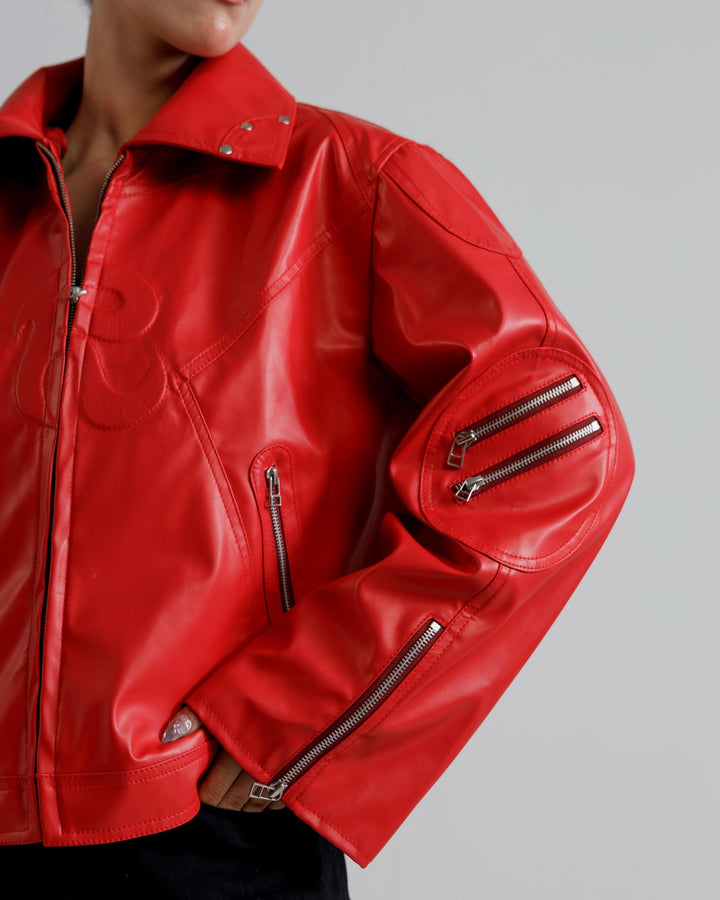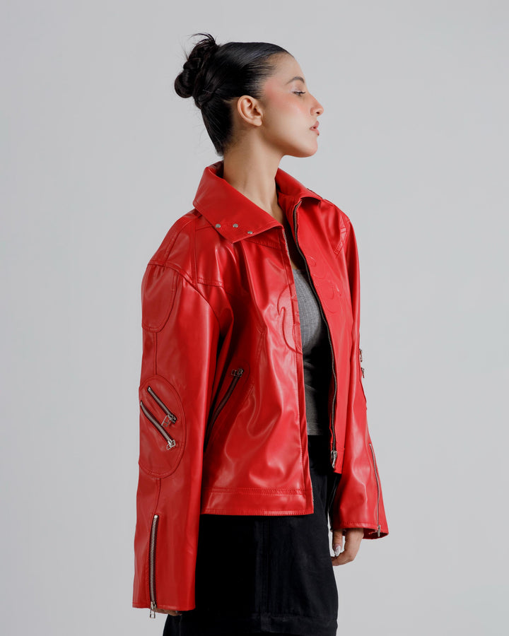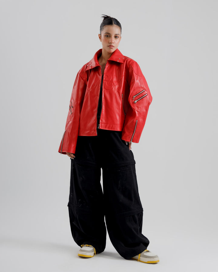 Crafted in premium faux leather with a lustrous red finish, this oversized silhouette features metallic zippers and sharp detailing for a sleek, structured look. It’s the statement layer that turns any outfit into a moment.