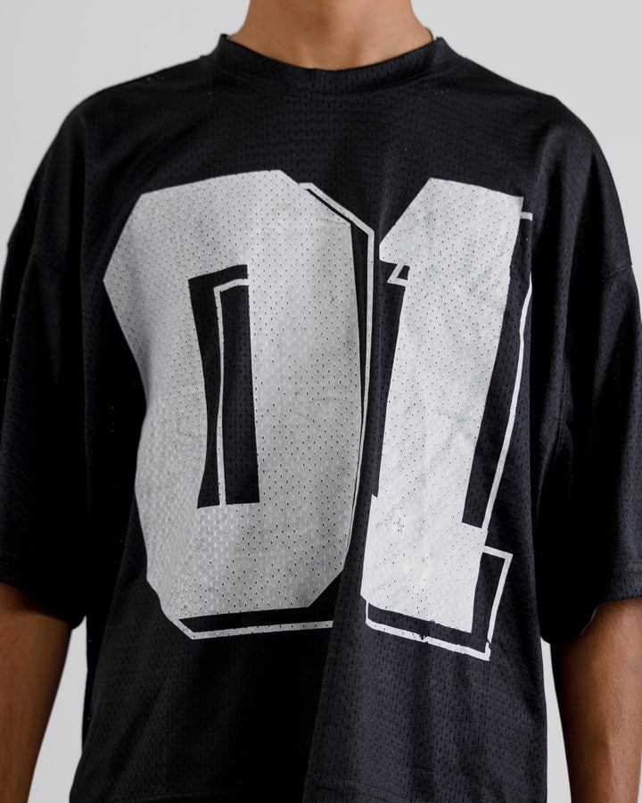 Make a bold play with the Cruiser Cut off Jersey —a oversized tee blending classic athletic wear with modern streetwear edge. Crafted from breathable, lightweight mesh fabric, this jersey features a striking oversized '01' graphic in white, creating immediate visual impact. Its relaxed, boxy fit is perfect for effortless layering or making a strong solo statement. This piece is essential for building a confident, street-ready look.