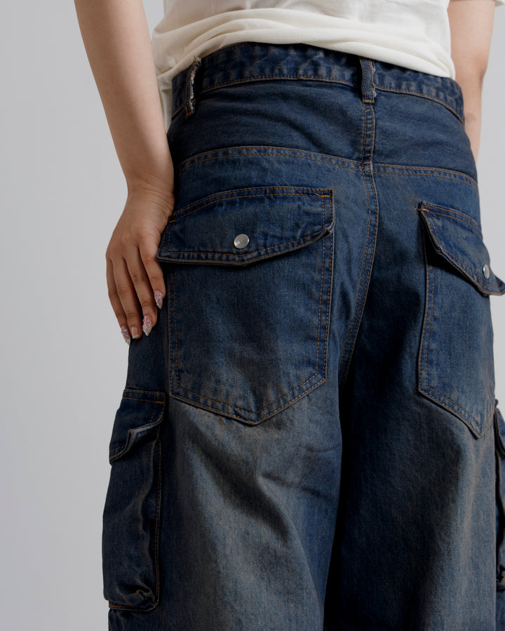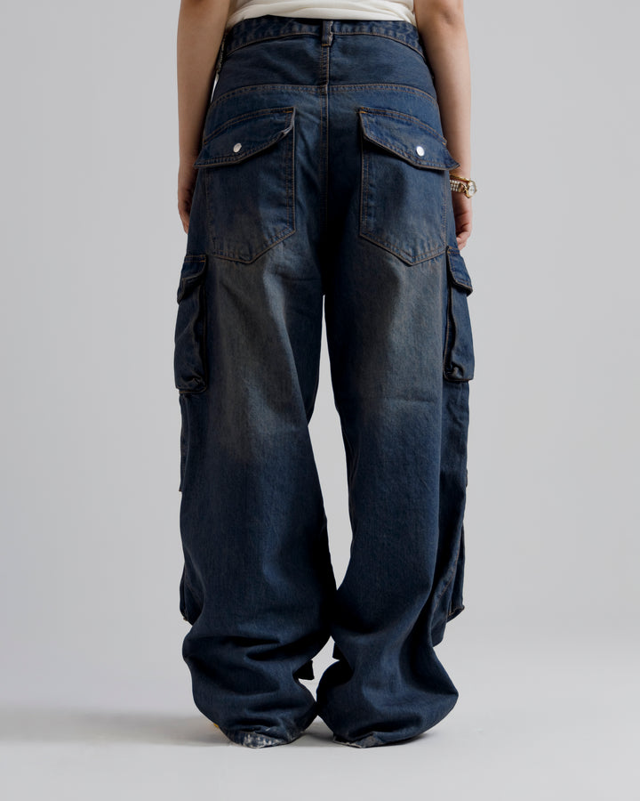 heavyweight denim with deep cargo pockets and subtle faded tones, they bring a laid-back edge to any outfit. Designed with a relaxed fit and adjustable waist tabs for everyday movement.