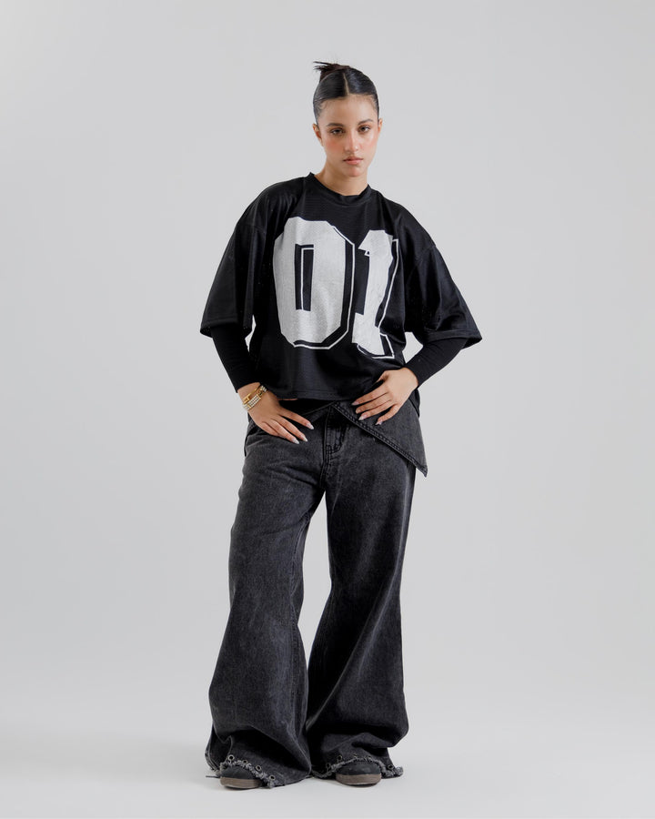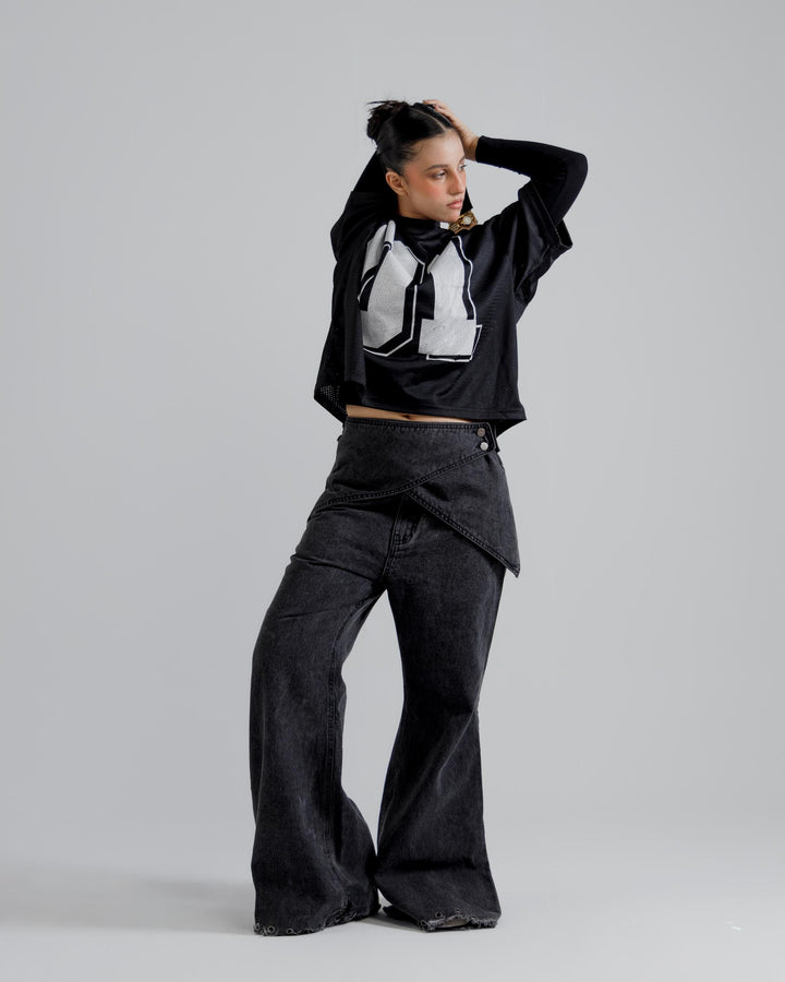 Make a statement that defies convention with the Eclipse Wrap Wide-Leg Denim. These aren't just jeans—they're a dramatic silhouette crafted in a rich, acid-washed black denim for a grunge-meets couture feel. The defining feature is the asymmetrical, wrap-over waist panel secured by metallic snaps, which creates the illusion of a mini-skirt over the trousers. Paired with a bold, exaggerated wide-leg cut, this piece offers maximum impact and essential street edge.