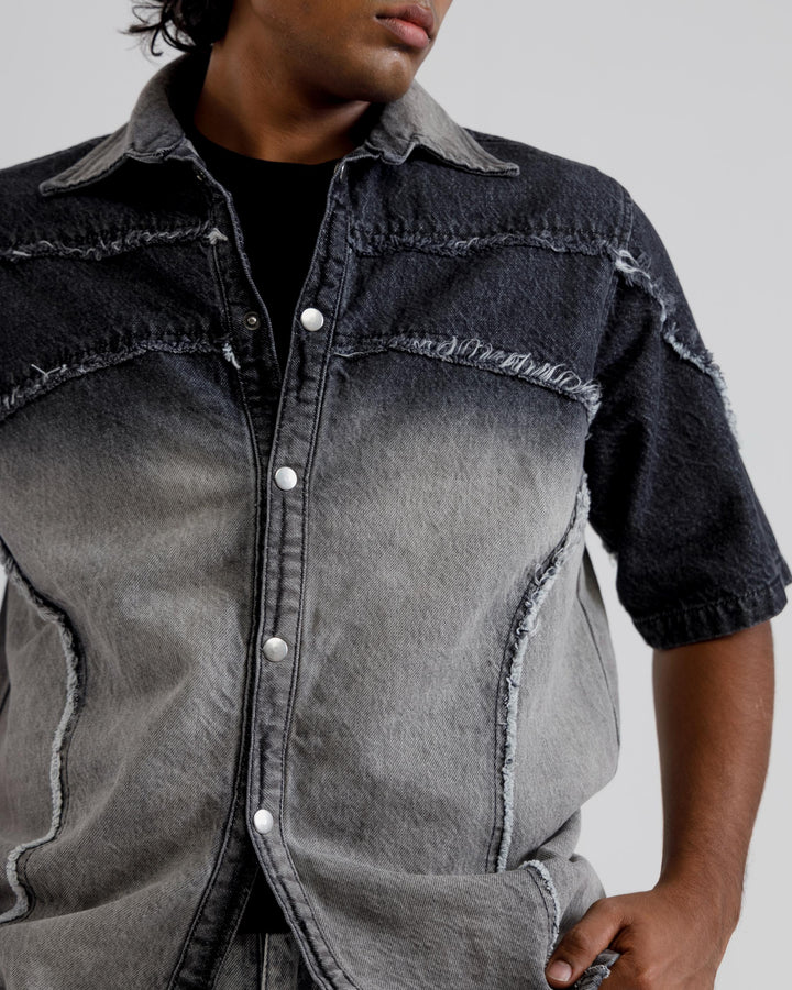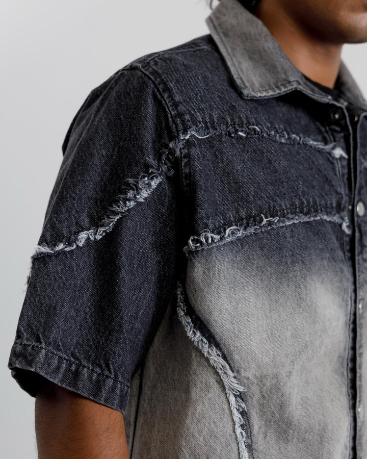 Command a raw, industrial aesthetic with the Shadow Fade Work shirt. This short-sleeve button-up is crafted from a unique two-tone washed denim-like fabric, featuring a dramatic dark charcoal yoke that fades into a lighter grey body. The design is accentuated by bold, visible contrast stitching and raw, distressed edges, giving it an authentically worn and deconstructed look. With a relaxed fit and a rugged appeal, this shirt is a statement piece for those who appreciate detailed craftsmanship and a rebellious edge.