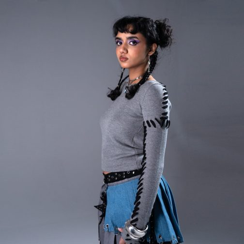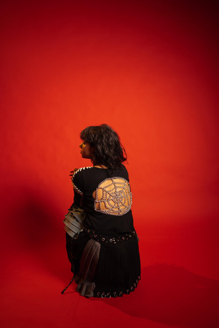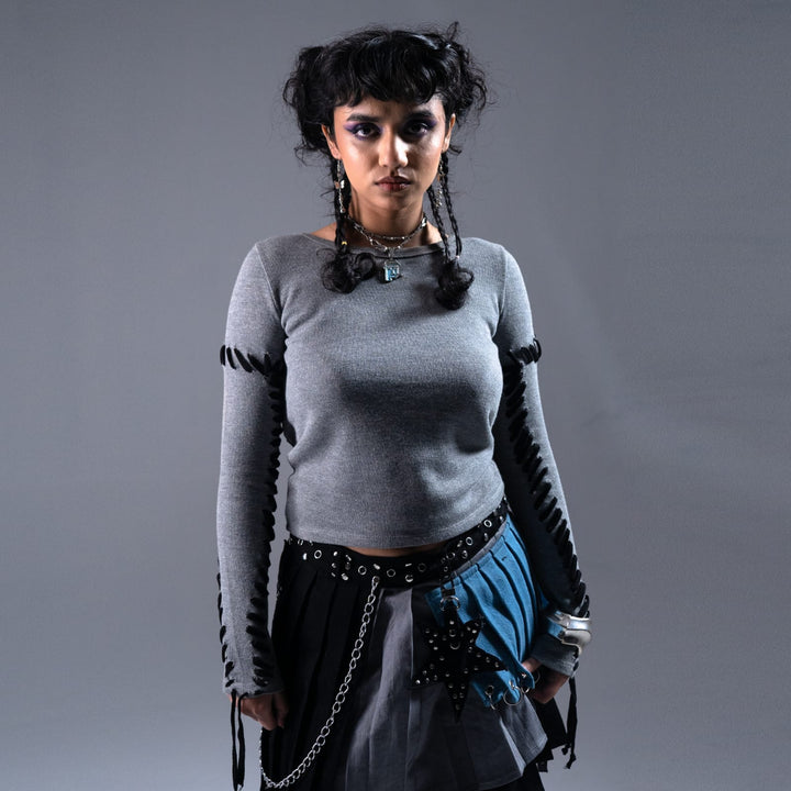 web-like pattern. The sleeves have distinct stitching details with white laces to it,